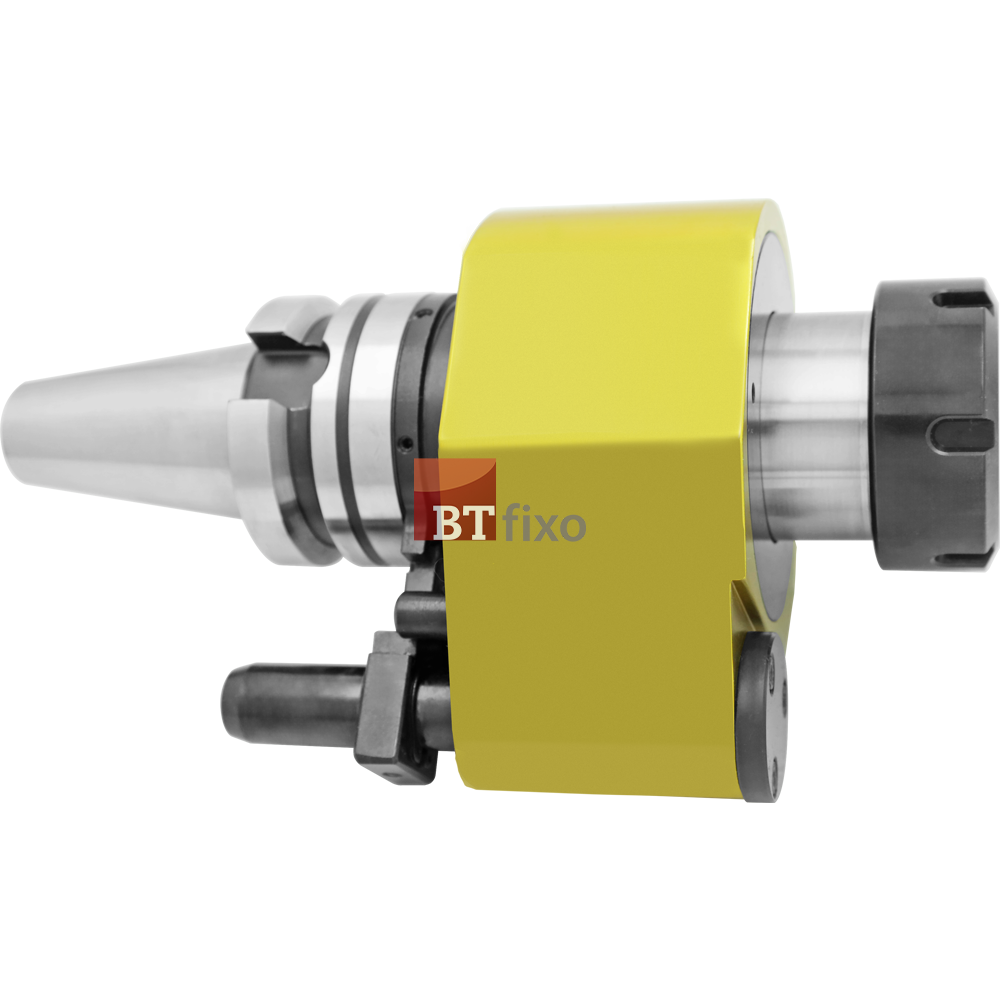 Porta Pinça com refrigeração lateral, foi desenvolvido para ser utilizado em máquinas que não possuem sistema de refrigeração interna. Através do dispositivo “stopper block” para fixação do ponto de alimentação do fluido (desenho disponível) que será alimentado com a refrigeração externa da máquina e assim transferindo para a refrigeração interna do cone e consequentemente a passagem interna pela ferramenta de corte.